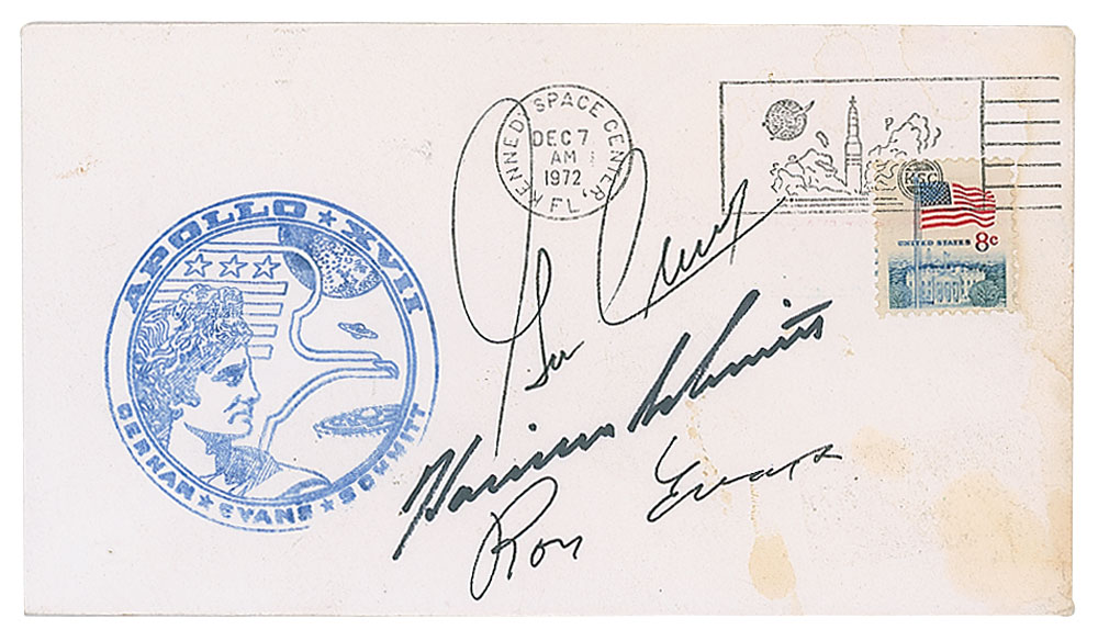 Apollo 17 launch day cover with a stamped cachet of the mission insignia, postmarked at Kennedy Space Center on December 7, 1972, signed in black felt tip by Gene Cernan, Harrison Schmitt, and Ron Evans. In very good to fine condition, with staining to the right side.