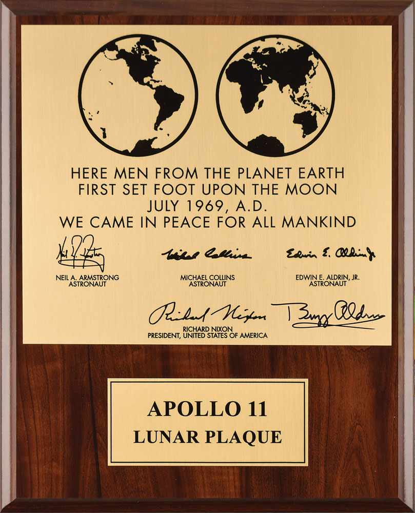 Replica 9 x 8 metal lunar plaque similar to the one left on the moon's surface by the Apollo 11 crew, affixed to a wooden 10.5 x 13 mount, signed below his facsimile signature in black felt tip by Buzz Aldrin. The iconic plaque reads: "Here men from the planet Earth first set foot upon the moon, July 1969, A. D. We came in peace for all mankind." In fine condition.