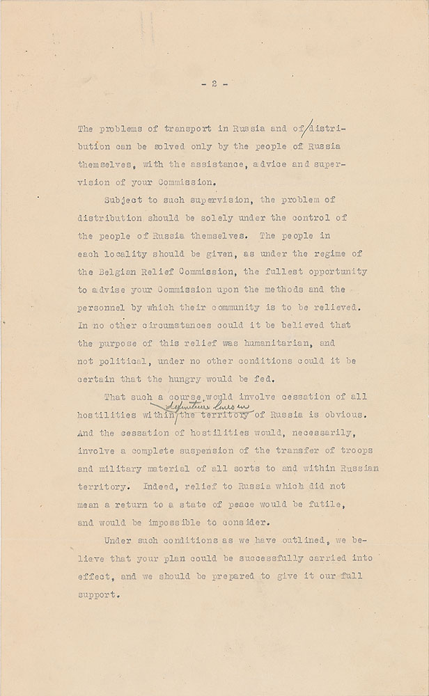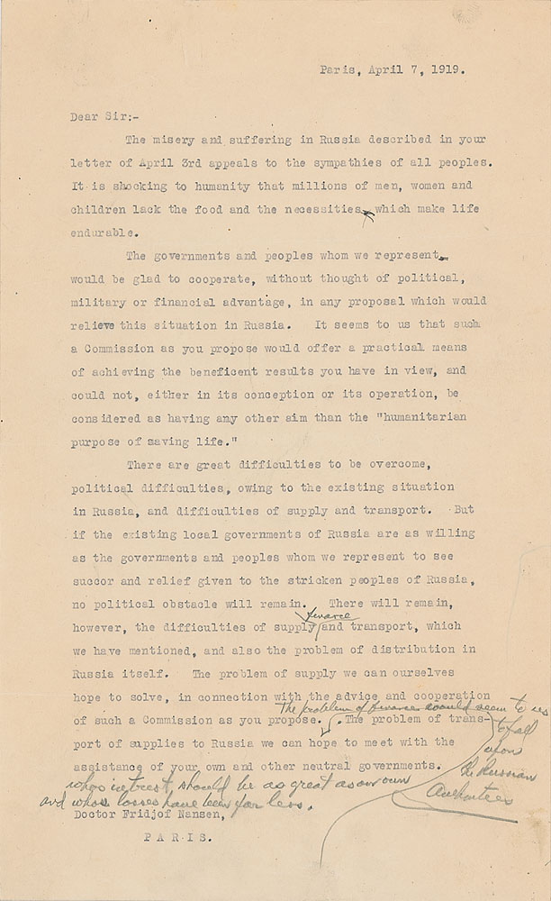 Hand-corrected telegram draft, two pages, 8 x 13, April 7, 1919. A draft of the response by the 'Big Four' (American President Woodrow Wilson, French Prime Minister Georges Clemenceau, British Prime Minister David Lloyd George, and Italian Prime Minister Vittorio Orlando), to Norwegian explorer and humanitarian Fridtjof Nansen's plea for food aid to Russia, hand-corrected in pencil by Herbert Hoover in an attempt to navigate the complicated politics surrounding the request. His most substantial change, in part (Hoover's corrections shown in italics): "The problem of finance would seem to us to fall upon the Russian authorities whose interest should be as great as our own and whose losses have been far less. The problem of transport of supplies to Russia we can hope to meet with the assistance of your own and other neutral governments." In fine condition, with a paperclip impression to the top of each sheet.