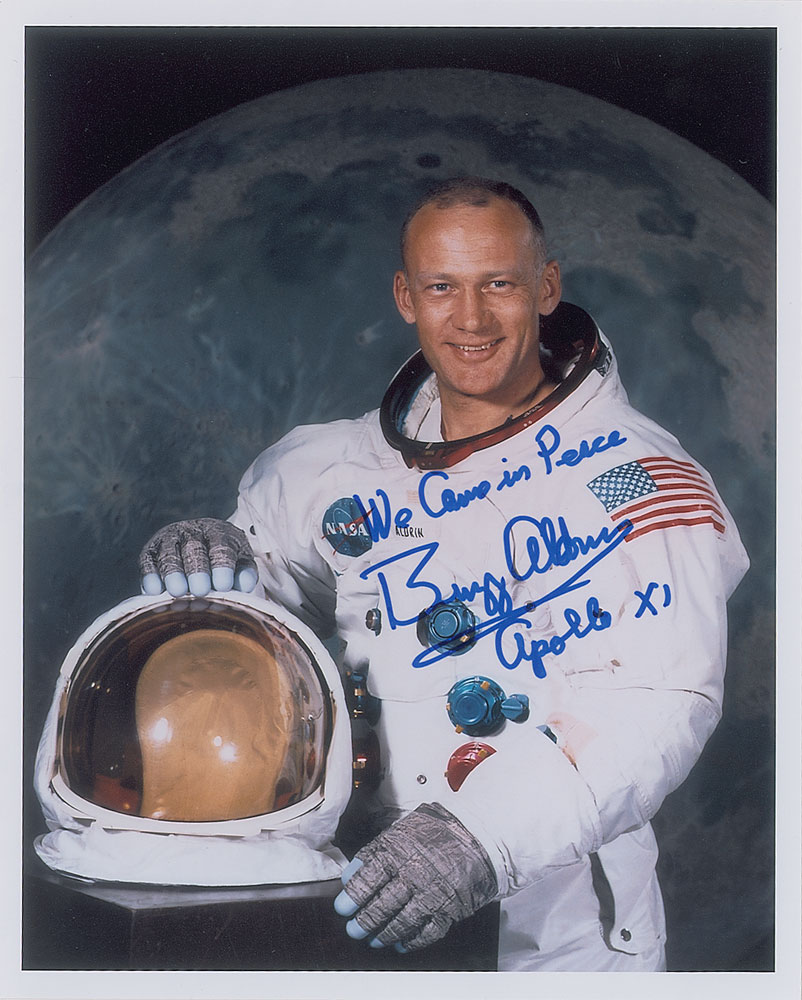 Color satin-finish 8 x 10 photo of LMP Aldrin posing in his white space suit against a lunar backdrop, signed in blue felt tip, "We Came in Peace, Buzz Aldrin, Apollo XI." In very fine condition.
