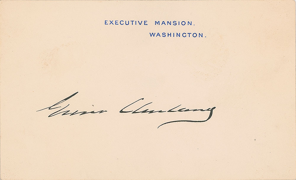 Executive Mansion card, 4.5 x 2.75, signed neatly in ink, "Grover Cleveland." In fine condition, with old mounting remnants on the reverse.