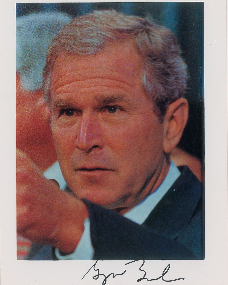Color glossy 8 x 10 close-up photo of the 43rd President of the United States of America, signed in black felt tip by George W. Bush. In fine condition. From The John Brennan In-person Autograph Collection.