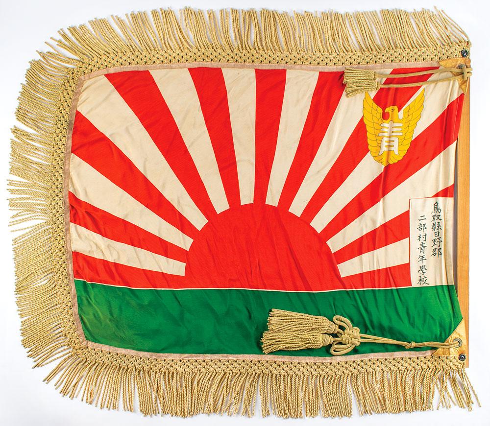 Printed, heavy silk World War II-era Japanese school flag, measuring 36 x 27, depicting a green horizon with rayed rising sun, featuring an eagle school emblem on the upper hoist corner. A small white rectangular inset has an ink-stamp of a school in western Honshu (main island). The flag has reinforced grommets at the hoist, and is lined with heavy brocade tassels. The flag is in excellent condition with very little fading of the colors, and only a few very minor stains. This was undoubtedly taken by a GI as a souvenir after the US occupation of Japan, and is an attractive WWII collectible that rates excellent condition overall.