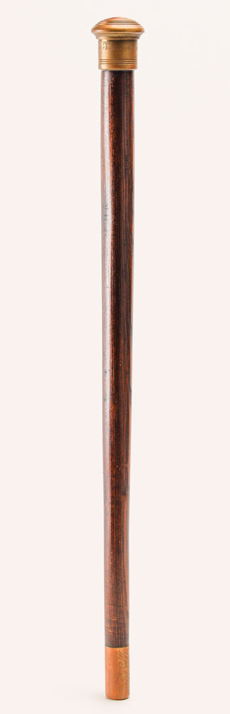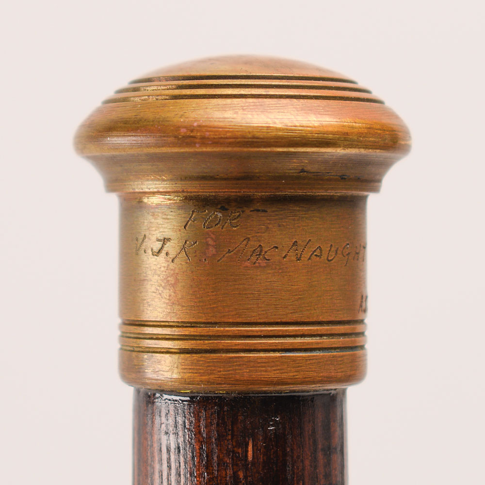 Wood removed from the USS Constitution during the frigate's 1980 restoration work, turned into a 19″ long cane with brass hardware at each end. The top is engraved, "For V. J. K. MacNaught, Esq., A.S.R.," and the end is engraved, "Douglas fir from the 1980 repair work on the Frigate 'Old Ironsides' at Boston, Mass., Sept. 25, 1981." Also includes two commemorative tokens honoring the USS Constitution. In fine condition.