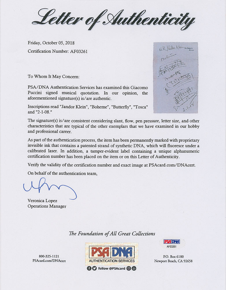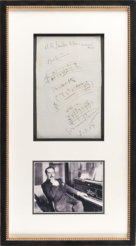Extraordinary triple AMQS on a light blue 6.25 x 9.75 sheet of his personal letterhead, inscribed at the top in fountain pen to "Jandor Klein," and signed at the conclusion, "Giacomo Puccini, 2.1.08." Puccini pens brief musical quotations from his three most beloved operas, writing the titles above: "Boheme," "Butterfly," and "Tosca." Addressed on the reverse in Puccini's hand. While other single AMQS from Puccini have sold in the past, this is the only document we know of where he inscribes scores for all three famous operas, making it a truly amazing and incredibly rare piece of history. Archivally double-matted and beautifully framed using museum quality glass with a photo of Puccini to an overall size of 13 x 23.25. In very good to fine condition, with mailing folds, some light creasing, and faint staining along the left edge. Immensely desirable and undoubtedly one-of-a-kind, this unprecedented triplet of musical quotations represents the sum of Puccini's most renowned, revered, and towering masterpieces. Accompanied by a full letter of authenticity from PSA/DNA.