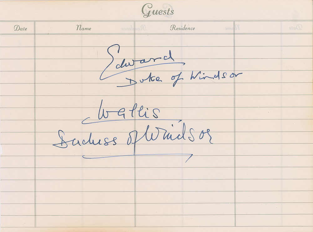 Fountain pen signatures, "Edward, Duke of Windsor" and "Wallis, Duchess of Windsor,” on an off-white 10 x 7.5 guestbook sheet. In fine condition.