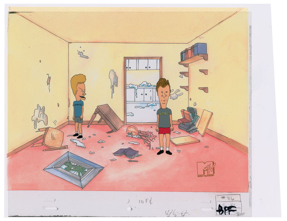 (MTV Networks, 1994) Original production cel from the animated television series Beavis and Butt-Head, which depicts the two teenage metal-heads standing in a trashed room, with the backdrop showing an overflowing sink. The cel is placed on a matching studio copy background. Character images measure .75 x 3.25 (Beavis) and 1 x 4 (Butt-Head), with overall dimensions of 14 x 11. The Butt-Head cel features the MTV label to lower right. In fine condition. Accompanied by a certificate of authenticity from MTV Networks.