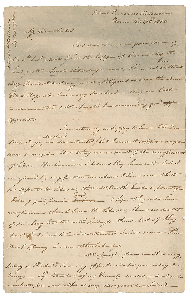 Superb Revolutionary War-dated ALS, signed "B. Arnold,” one page, both sides, 8 x 13, September 16, 1780. Addressed from "Head Quarters Robinsons House" in West Point, New York, Arnold writes to his sister Hannah Arnold in Philadelphia only days before he would meet with John André to finalize his plans to turn the Hudson River stronghold of West Point over to the British. Additionally, he reports to his sister the safe arrival of his wife, Peggy Shippen Arnold (1760-1804), at West Point and inquires on his three sons who were in his sister's care.