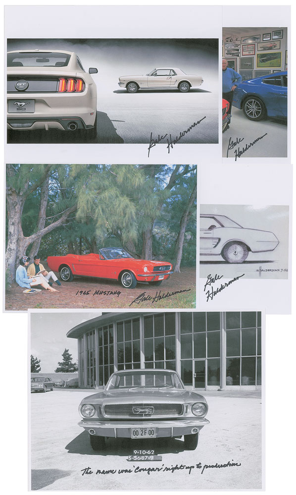 Original designer of the first Ford Mustang, who then shepherded his design into production. Five laserprint 11 x 8.5 photos signed in black felt tip by Gale Halderman, with images including: Halderman's sketch of the 1964 Ford Mustang; the front of the Cougar, which later became the Mustang; a bright red convertible Mustang below tree branches; Halderman posing next to a showroom Mustang; and the original white Mustang next to the rear of the GT 50 Year Limited Edition model. In overall fine condition. Accompanied by two Gale Halderman Museum business cards, both signed on the reverse in black ink.