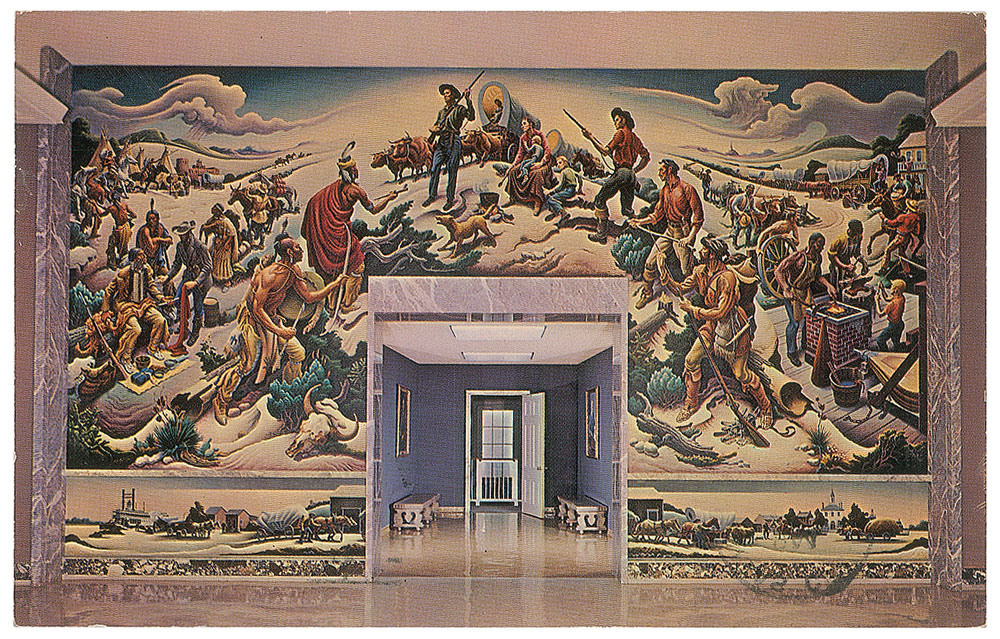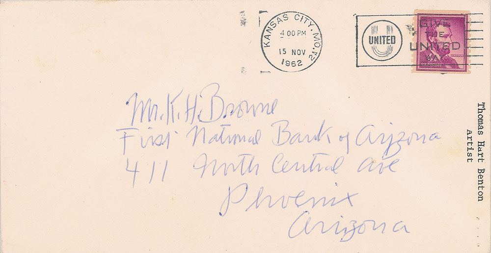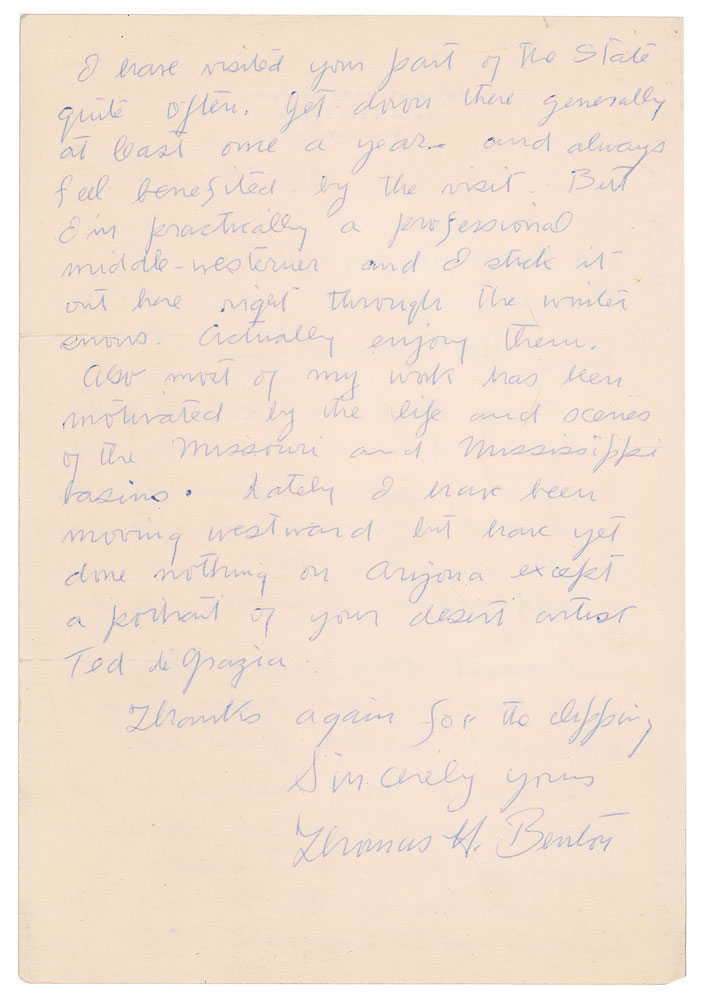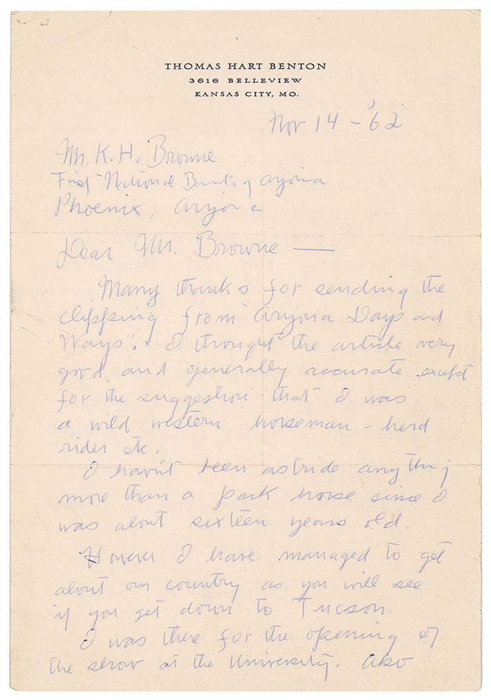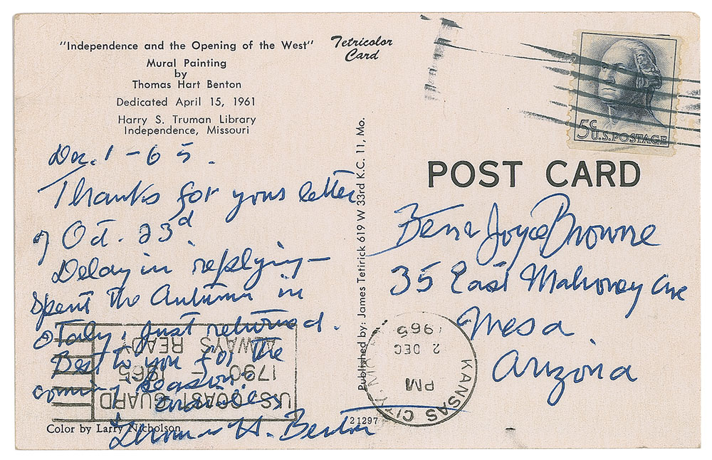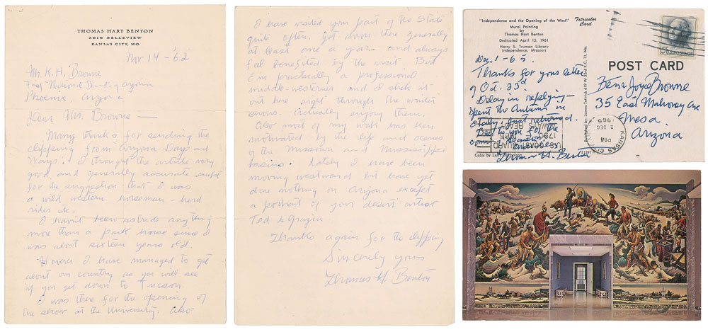 Renowned American artist (1889-1975) whose distinctive 'regionalist' style made him one of the most influential figures in American art during the 1930s and 1940s. Two ALSs: one signed "Thomas H. Benton," one page both sides, 7.25 x 10.5, personal letterhead, November 14, 1962, in part: "Many thanks for sending the clipping from 'Arizona Days and Ways.' I thought the article very good, and generally accurate except for the suggestions that I was a wild western horseman, herd rider etc. I haven't been astride anything more than a park horse since I was about sixteen years old?I'm practically a professional middle-westerner and I stick it out here right through the winter snows. Actually enjoy them. Also most of my work has been motivated by the life and scenes of the Missouri and Mississippi basins. Lately I have been moving westward but have yet done nothing on Arizona except a portrait of your desert artist Ted di Grazia"; and one signed "Thomas H. Benton," one page on a 5.5 x 3.5 postcard depicting his mural 'Independence and the Opening of the West,' December 1, 1965, in part: "Thanks for your letter of Oct. 23rd. Delay in replying—spent the autumn in Italy. Just returned. Best to you for the coming season." In overall very good to fine condition, with staple holes and a short fold split to the letter. Accompanied by the original mailing envelope for the letter addressed in Benton's hand.