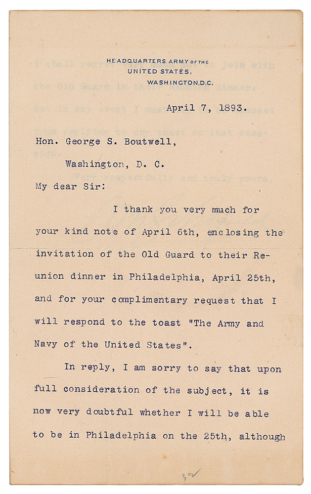 Union general (1831-1906) who served as army commander in Sherman's Atlanta campaign and who later became General in Chief of the army. TLS signed “J. M. Schofield,” two pages on two adjoining sheets, 5 x 8, Headquarters Army of the United States letterhead, April 7, 1893. Letter to the Hon. George S. Boutwell, regretfully declining an invitation to the Old Guard Reunion dinner. In part: "Thank you for your kind note?enclosing the invitation of the Old Guard to their Reunion dinner in Philadelphia?and for your complimentary request that I will respond to the toast 'The Army and Navy of the United States'?but in any event I must beg to be excused." In fine condition.
