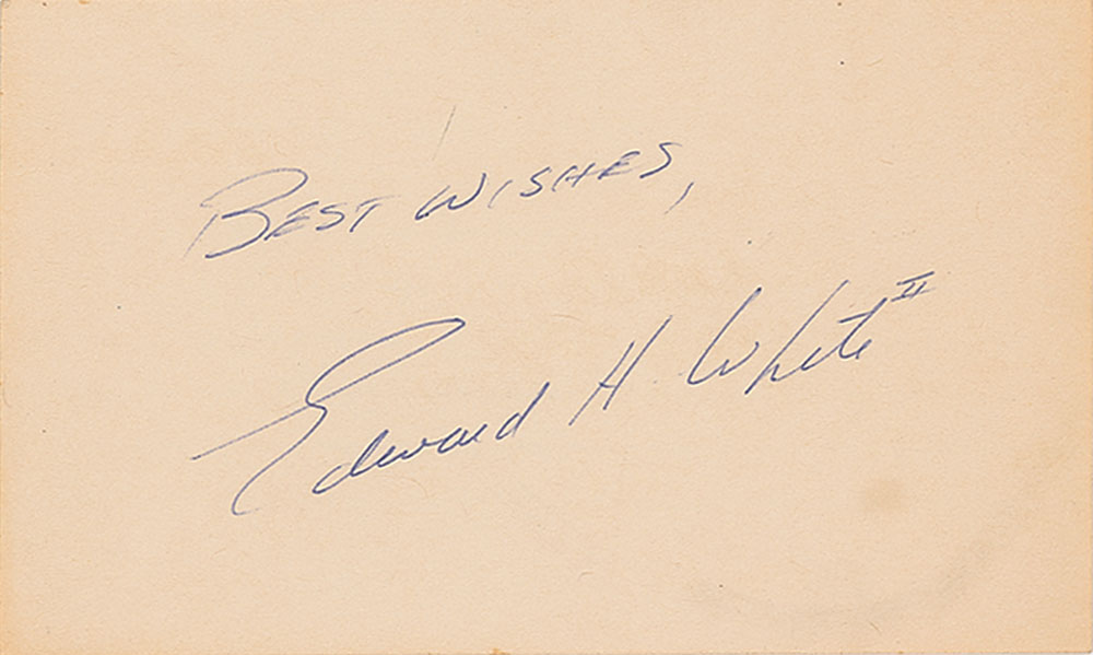 Sought-after vintage ballpoint signature, "Best wishes, Edward H. White II,” on an off-white 5 x 3 card. In fine condition, with a small, faint stain to the lower right.