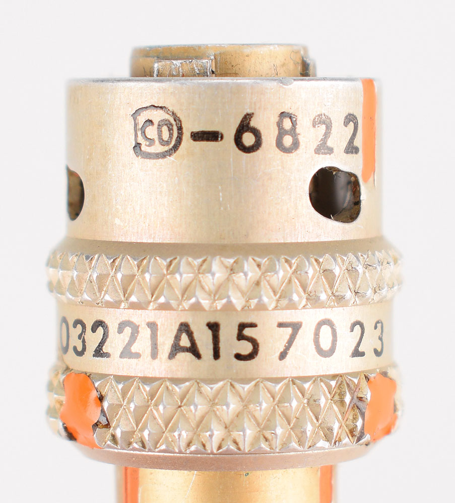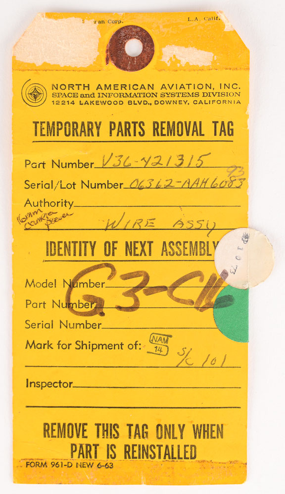 Flown connector removed from the end of the Apollo 7 Data Acquisition Camera (DAC) power cable, measuring 2″ long, marked with part numbers: "ME414-0570-0009 03221A157023." Includes the original North American Aviation temporary parts removal tag, identifying the piece as a "16mm Camera Power Wire Assy" for "S/C 101," denoting the Apollo 7 spacecraft CSM-101. The Apollo 7 DAC was a 16mm camera mounted in a window to record events outside the spacecraft during the first manned Apollo flight. In fine condition.