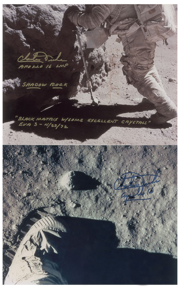 Two color 10 x 8 photos signed by the 10th man on the moon: a satin-finish photo of an Apollo astronaut's boot on the lunar surface, signed in black felt tip, "Charlie Duke, Apollo 16"; and a semi-glossy photo of an astronaut taking permanently shadowed soil samples from beneath the 3-meter-high lunar boulder called the 'Shadow Rock,' signed in gold ink, "Charlie Duke, Apollo 16, LMP, Shadow Rock, 'Black matrix w/some excellent crystals,' EVA 3—4/23/72." In overall fine condition. Accompanied by a certificate of authenticity from JSA for the satin-finish photo.