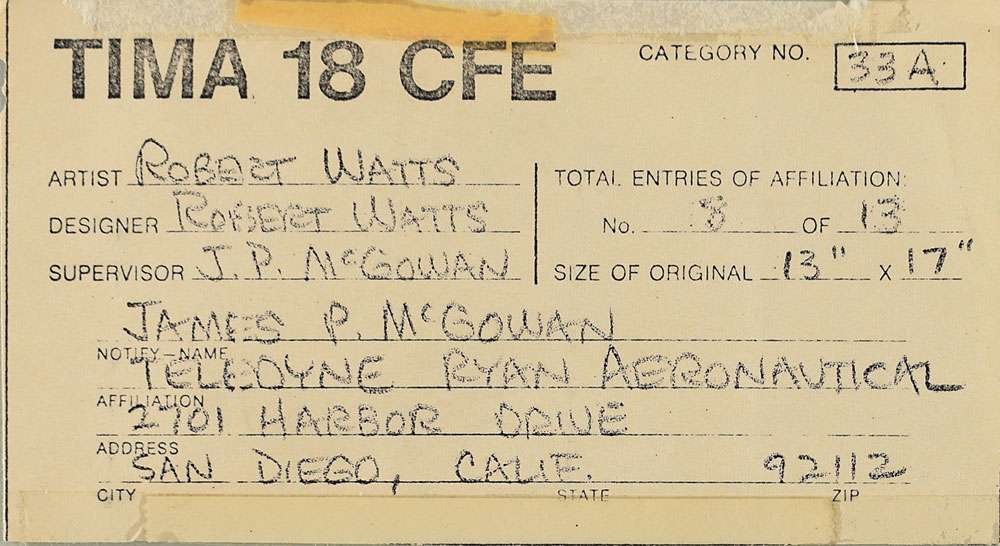 Original Project Apollo concept painting by Robert Watts for Teledyne Ryan Aeronautical, accomplished in gouache on 15.25 x 12 illustration board, no date but circa late 1960s/early 1970s. The work shows the Lunar Module on the moon with two astronauts exploring the lunar surface at its feet: one deploys an experiment in the background, while another wheels the Modular Equipment Transporter in the foreground. Signed in the lower right corner in paint, "Robert Watts." A slip affixed to the reverse identifies the artist and designer as Watts, his supervisor as James P. McGowan, and their affiliation as Teledyne Ryan Aeronautical. Double-matted to an overall size of 21 x 18. In fine condition. A detailed and accurate Apollo-era rendering of a fantastic lunar landing scene.