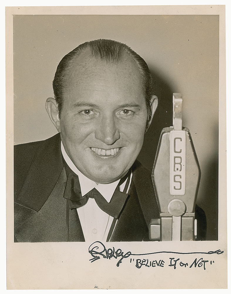 American cartoonist, entrepreneur, and amateur anthropologist (1890-1949) who is known for creating the Ripley's Believe It or Not! newspaper panel series, radio show, and television show which feature odd facts from around the world. Vintage glossy 6.75 x 8.5 photo of Robert Ripley smiling next to a CBS microphone, signed in the lower border in fountain pen, "Ripley, 'Believe It or Not.'" In very good to fine condition, with scattered light creasing, three small border tack holes, and emulsion irregularity to the upper right.
