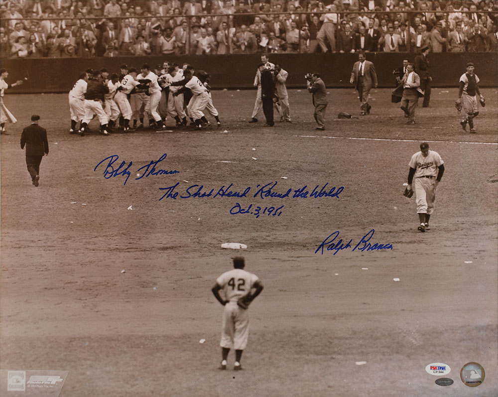 Satin-finish 20 x 16 photo of the New York Giants crowding around Bobby Thomson after he hit a pennant-clinching home-run off Brooklyn Dodgers pitcher Ralph Branca, signed in blue felt tip, "Bobby Thomson, The Shot Heard 'Round the World, Oct. 3, 1951" and "Ralph Branca." In very fine condition, with a PSA/DNA label affixed to lower right corner. Accompanied by a certificate of authenticity from PSA/DNA.