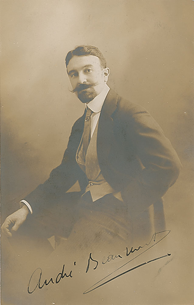 Pseudonym of Jean Louis Conneau (1880-1937), a French aviation pioneer, Naval Lieutenant, and Flying boat manufacturer. In 1911 he won three of the toughest aeronautical tests: the 'Paris-Rome' race, the first Circuit d'Europe, and the Daily Mail Circuit of Britain Race. Vintage matte-finish 3.5 x 5.5 French postcard photo of Andre Beaumont in a handsome seated pose, signed in fountain pen. In fine condition, with faint silvering, and some skipping to the last name.