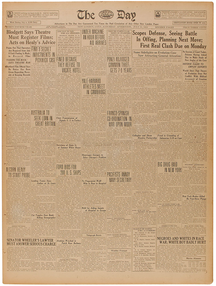 Con man and swindler (1882-1949) who promised huge profits for buying discounted postal reply coupons in other countries and redeeming them at face value in the United States. In reality, he was paying early investors using the investments of later investors. This type of scheme is now known as a 'Ponzi scheme.' Original July 11, 1925, afternoon edition of New London, Connecticut's The Day, 17 x 22.5, 16 pages. One byline on the front page reads, "Ponzi Adjudged Common Thief; Gets 7-9 Years." Story reads, in part: "Charles Ponzi?was found guilty on four indictments charging larceny from investors in his international postal reply coupons enterprise." Central horizontal fold, mild toning, and marginal binding holes to left edge, otherwise fine condition.