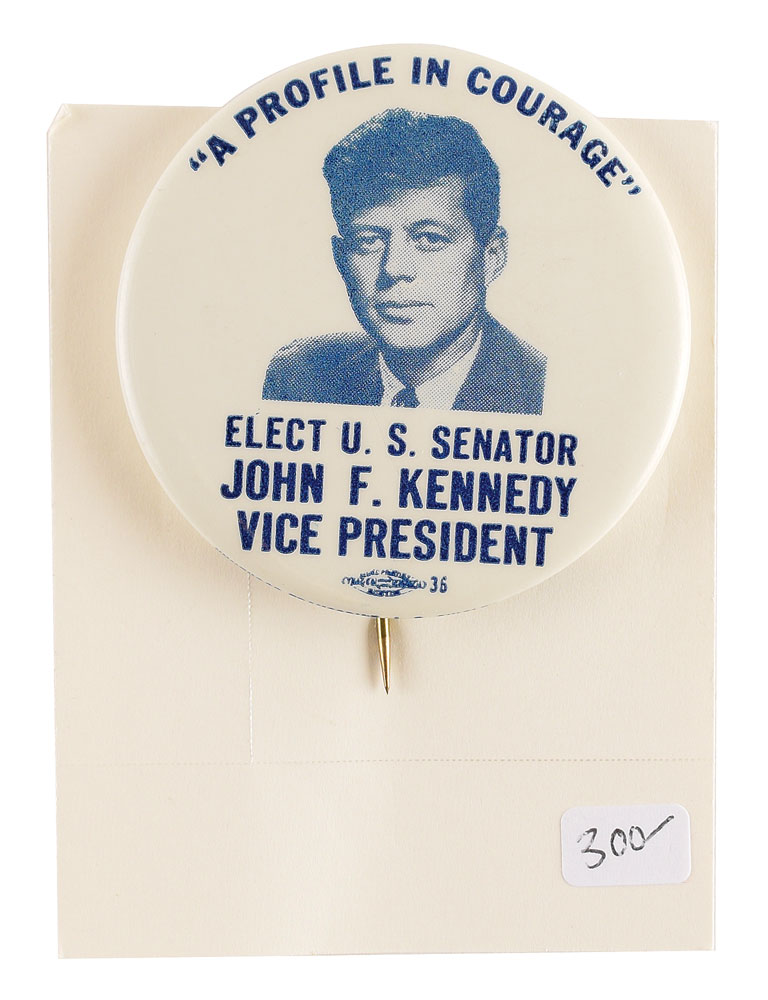 Uncommon 2.25″ celluloid pin from 1956 promoting JFK as a vice presidential candidate, featuring a youthful portrait with text referencing his Pulitzer Prize-winning book "A Profile in Courage," and pitching his candidacy, "Elect U.S. Senator John F. Kennedy Vice President." The bottom edge of the pin notes the producer, "Winthrop Transcript, A. P. Quigley, Publisher." In fine condition, with minor rust spots to the back. Kennedy was the runner-up in the vice presidential balloting at the 1956 Democratic National Convention, coming in second to Senator Estes Kefauver who joined Adlai Stevenson on the Democratic Party's ticket.