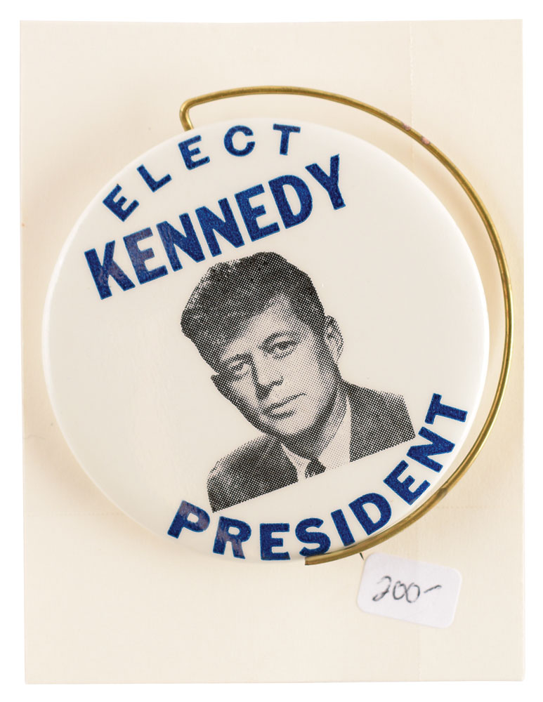 Attractive 2.25″ celluloid pin promoting JFK as a presidential candidate, featuring a youthful portrait with bold blue text, "Elect Kennedy President." The bottom edge of the pin notes the producer, "Winthrop Transcript, Inc., Andrew P. Quigley, Publisher." In fine condition, with light rusting to the back.
