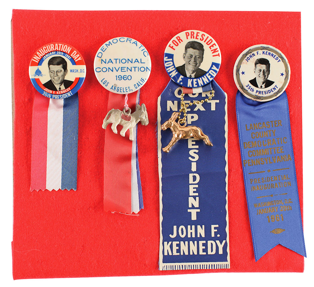 Collection of 26 larger pins, buttons, and ribbons associated with John F. Kennedy, mostly from his 1960 presidential campaign, measuring between 1 1/4″ and 4″, several featuring portraits of Kennedy, two jugate pins with JFK and LBJ, three variations of "If I Were 21, I'd Vote for Kennedy," a large "Mamie Start Packing, The Kennedy's Are Coming" button, two lenticular "Vari-Vue" buttons, three inauguration day buttons (two with ribbons), a 1960 Democratic National Convention pin with ribbon, a memorial button, and others. In overall fine condition.