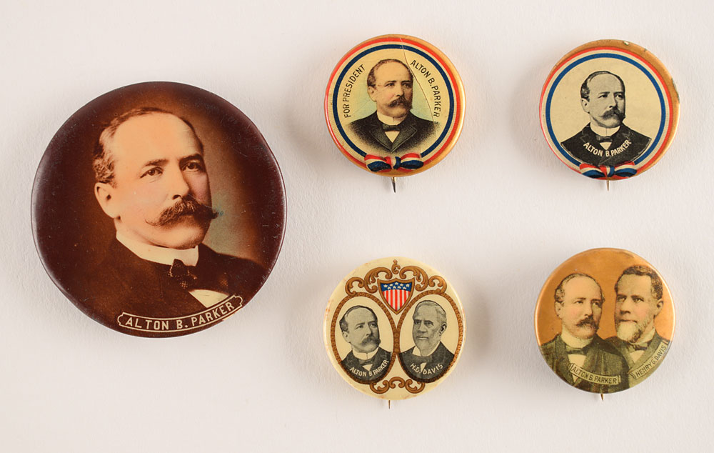 Collection of five celluloid pinback buttons from the 1904 presidential campaign, measuring 1 1/4″ and 2 1/4″, with two featuring jugate portraits of Alton Parker and Henry G. Davis, and three depicting Parker alone. Paper backer inserts include F. Miller & Co., Baltimore Badge & Novelty Company, and Whitehead & Hoag. In overall very good to fine condition, with some surface cracks and edge stains. The Democratic Parker-Davis ticket lost in a landslide to the incumbent Theodore Roosevelt.