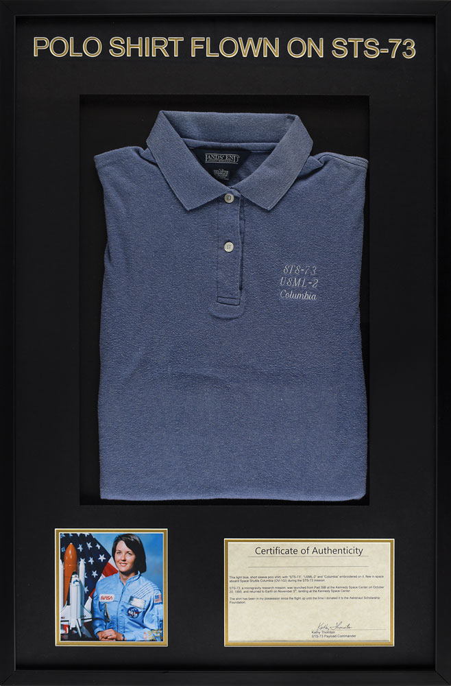 Kathy Thornton's light blue Land's End polo short sleeve shirt worn and flown during the STS-73 mission, women's size small, embroidered on the left chest in white thread, "STS-73, USML-2, Columbia." Attractively double-matted and framed to an overall size of 22 x 33.5; the framed display also features a photo and a signed certificate of authenticity from Thornton, which reads, in part: "This light blue, short sleeve polo shirt?flew in space aboard Space Shuttle Columbia (OV-102) during the STS-73 mission?The shirt has been in my possession since the flight up until the time I donated it to the Astronaut Scholarship Foundation." In fine condition.
