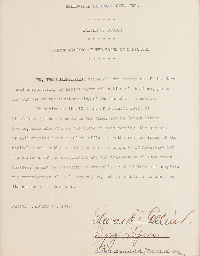 DS, signed “Edward T. Collins,” one page, 7 x 8.75, January 10, 1947. A waiver of notice from the Wellsville Baseball Club, Inc., regarding the first meeting of the board of directors, in part: "We designate the 10th day of January, 1947, at 11 o'clock in the forenoon as the time, and 24 Jersey Street, Boston, Massachusetts as the place of said meeting, the purpose of said meeting to elect officers, authorize the issue of the capital stock, authorize the purchase of property if necessary for the business of the corporation and the transaction of such other business as may be necessary or advisable to facilitate and complete the organization of said corporation, and to enable it to carry on its contemplated business." Signed at the conclusion in fountain pen by Collins. Double-matted and framed with a photo and two advertisements of Collins to an overall size of 25 x 17.75. In fine condition.