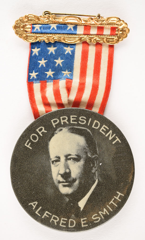 Highly attractive 2 1/4″ picture badge from Smith's 1928 presidential campaign, with white text reading, "For President, Alfred E. Smith," suspended from a 2″ American flag ribbon attached to a gold-tone pin. Reverse bears a Lopez Badge & Novelty Co. paper backer insert. In fine condition.