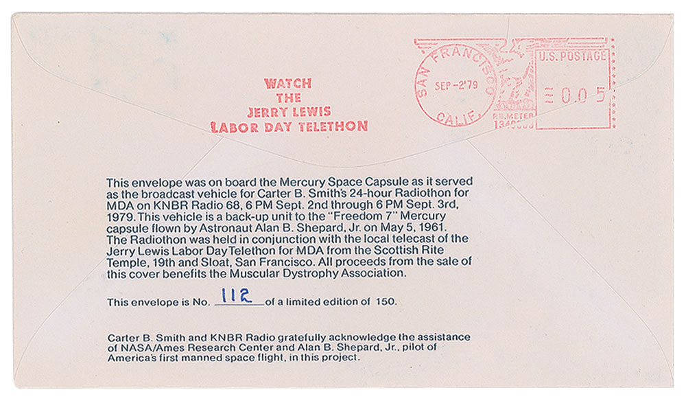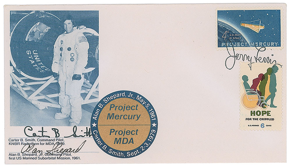 Limited edition cover 'carried' on board a backup Mercury capsule as it served as the broadcast vehicle for Carter B. Smith's 24-hour radiothon for MDA on KNBR radio on September 2-3, 1979, numbered 112/150, signed in black felt tip by Alan Shepard and Carter B. Smith. Also bears a stamped Jerry Lewis signature and a "Watch the Jerry Lewis Labor Day Telethon" postmark on the reverse. In fine condition.