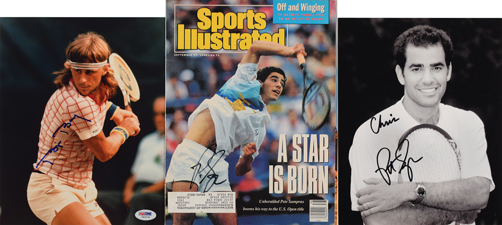 Three items signed by all-time tennis greats: a color glossy 8 x 10 photo of Bjorn Borg in action, signed in blue felt tip; a glossy 8 x 10 portrait of Pete Sampras, signed and inscribed in black felt tip, "Chris, Pete Sampras"; and a Sports Illustrated magazine cover from 1990 featuring Sampras with the headline "A Star Is Born," signed in black felt tip by Sampras. In overall fine condition, with a PSA/DNA label affixed to the corner of the Borg photo. Accompanied by a certificate of authenticity from PSA/DNA for Borg.