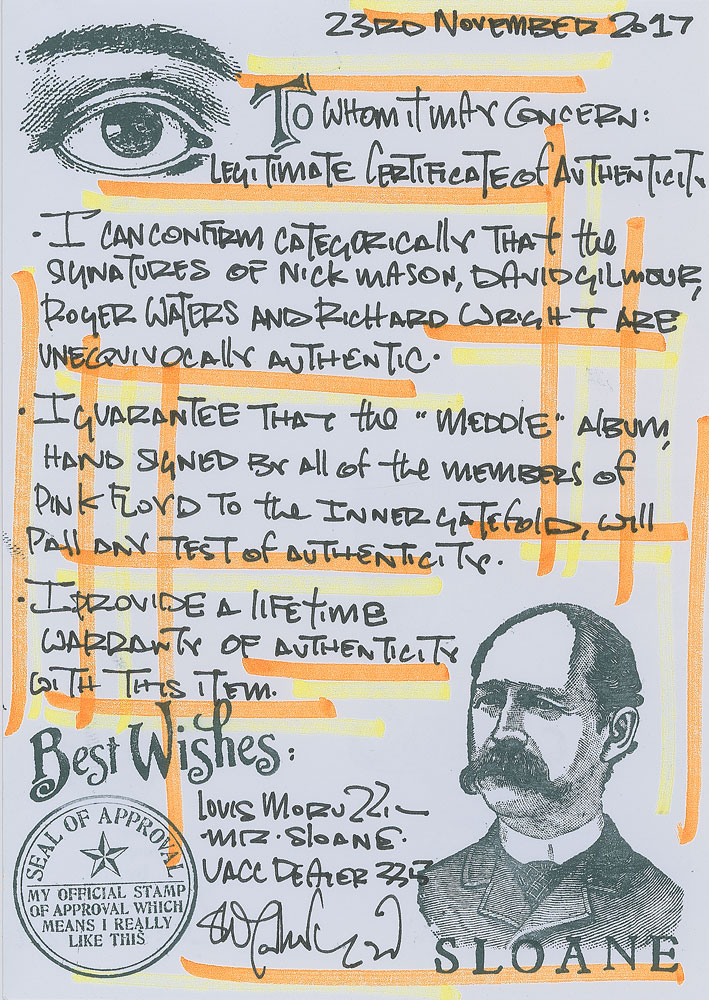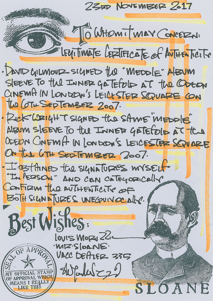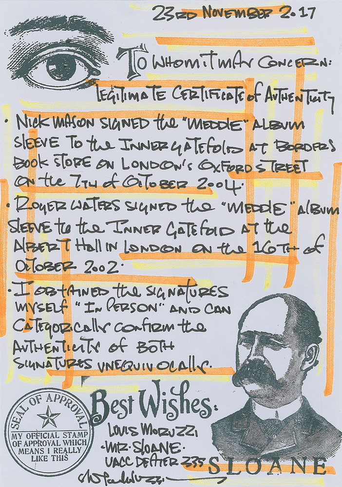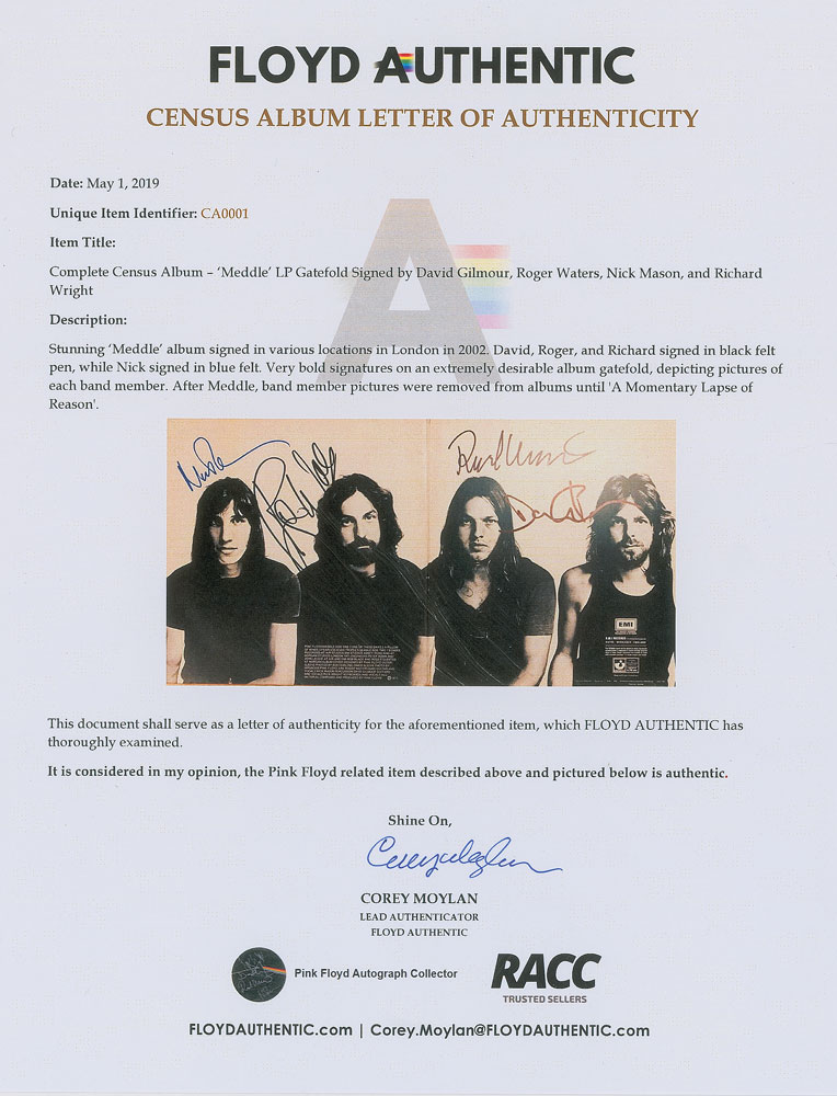 Meddle album by Pink Floyd, signed prominently on the attractive inner gatefold in black felt tip by Roger Waters, David Gilmour, and Richard Wright, and in blue felt tip Nick Mason. In fine condition. The record is included. Accompanied by a certificate of authenticity from Floyd Authentic and a letter of provenance from the original recipient, who notes that the Mason signature was obtained at Borders Books in London on October 7, 2004; the Waters signature at Albert Hall in London on October 16, 2002; and both the Gilmour and Wright signatures at the Odeon Cinema in London on September 6, 2007.