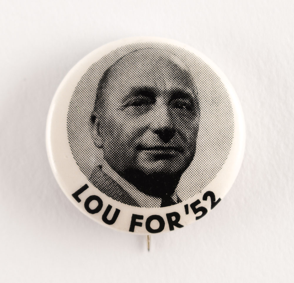 Rare 1″ celluloid pinback button created in support of Louis A. Johnson's candidacy for the Democratic presidential nomination in 1952, featuring a portrait of Johnson with black text below, "Lou for '52." In fine condition. Johnson had been the chief fundraiser for Harry S. Truman's campaigns, and served as Secretary of Defense under Truman from 1949-1950. His campaign for president was short-lived, and little record of it exists today. From the collection of Brigadier General Robert L. Schulz, longtime military aide to Dwight D. Eisenhower.