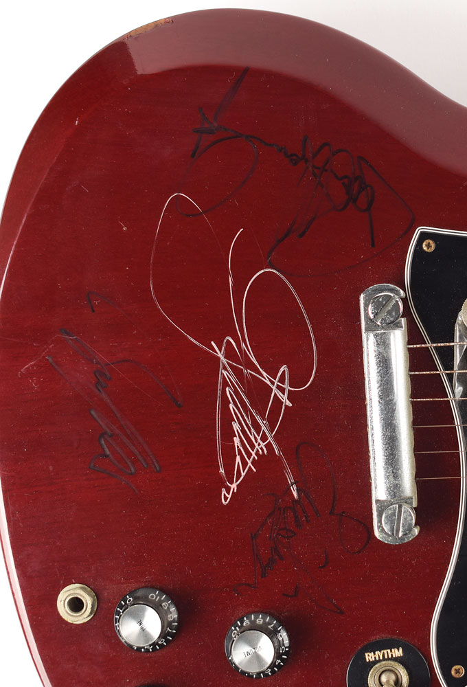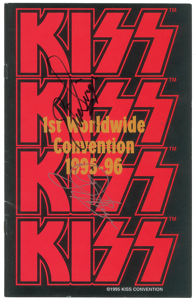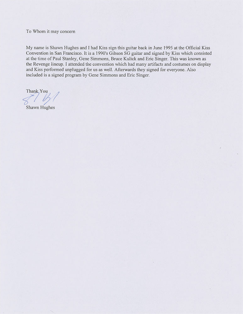 Handsome maroon-bodied Gibson SG electric guitar, signed on the body in pink ink by Gene Simmons, and in black felt tip by Paul Stanley, Bruce Kulick, and Eric Singer. In fine condition, with a few scuffs to the body and fair contrast to the black felt tip signatures. Accompanied by a program for the KISS: 1st Worldwide Convention, 1995-96, signed on the front cover by Simmons and Singer; a convention pass signed by Stanley, Simmons, Singer, and Kulik; and a letter of provenance from the original recipient: "I had Kiss sign this guitar back in June 1995 at the Official Kiss Convention in San Francisco. It is a 1990's Gibson SG guitar and signed by Kiss which consisted at the time of Paul Stanley, Gene Simmons, Bruce Kulick and Eric Singer. This was known as the Revenge lineup. I attended the convention which had many artifacts and costumes on display and Kiss performed unplugged for us as well. Afterwards they signed for everyone." Includes a Gibson USA carrying case.
