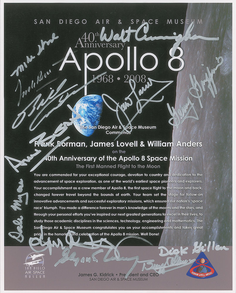 Attractive color 8.5 x 10.75 poster for the 40th Anniversary of the Apollo 8 mission as presented by the San Diego Air & Space Museum in 2008, signed in silver ink by an assortment of astronauts and flight directors, including: Alan Bean, Buzz Aldrin, James Lovell, Bill Anders, Frank Borman, Walt Cunningham, Gene Kranz, Gerry Griffin, Glynn Lunney, Dale Myers, Dick Gillen, and one other. In very fine condition. Accompanied by a certificate of authenticity from Farthest Reaches, in part: "The promotional item for the San Diego Air Space Museum's 40th Anniversary of Apollo 8 event?comes from the personal collection of former NASA Flight Controller Eugene F. Kranz?[who] was in attendance that evening and personally obtained all of the signatures."