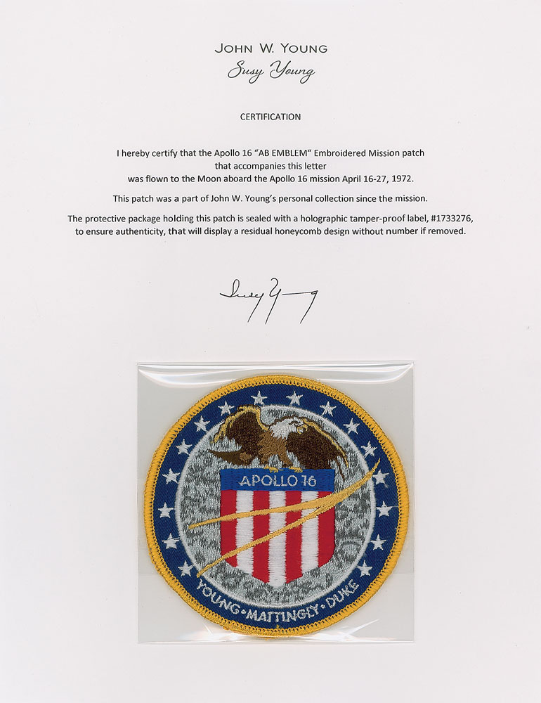 Scarce flown embroidered ‘AB Emblem’ Apollo 16 mission insignia patch carried to the moon on Apollo 16, measuring 4″ in diameter, encapsulated in a tamper-proof sleeve and affixed to a certificate of authenticity signed by Susy Young, the wife of the late Command Module Pilot John Young, in part: "I hereby certify that the Apollo 16 ‘AB Emblem’ Embroidered Mission patch that accompanies this letter was flown to the Moon aboard the Apollo 16 mission April 16-27, 1972. This patch was a part of John W. Young’s personal collection since the mission." These handsome patches were worn on post-flight jumpsuits and flown as souvenirs. In fine condition.