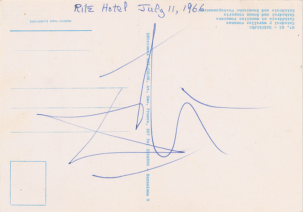 Vintage ballpoint signature, "Dali,” on the reverse of a color glossy 6 x 4.25 postcard of the Cathedral of Barcelona. Collector's notation indicates that the autograph was obtained at the Ritz Hotel on July 11, 1966. In fine condition.