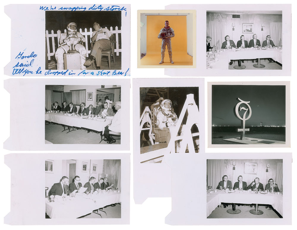 Unusual group lot of eight vintage original NASA photos, glossy and semi-glossy, ranging in size from 3.5 x 3.5 to 7.5 x 4.25, each commemorating the Faith 7 flight of Mercury astronaut Gordon Cooper. The lot includes: a color full-length portrait of Cooper in his space suit; a nighttime view of the Mercury Program monument; and a group of eight early Polaroid photos of Cooper relaxing, undergoing a training exercise, and during a dinner ceremony. The photo of Cooper laughing with another gentleman annotated in another hand: "We're swapping dirty stories. Gordo said tell you he dropped in for a short beer!" In overall fine condition, with some smudging to annotated photo. From the M. Edward Thomas Collection.