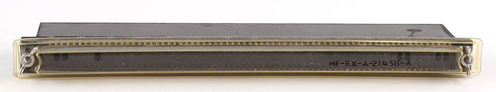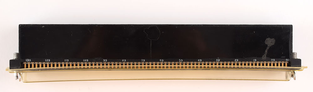 Logic module from a Block I Apollo Guidance Computer (AGC), measuring 10″ x 2″ x .75″, marked on the edge: "Logic Module A1-A16, NASA No. 1003074, Rev J, Mfg by Raytheon Co., Serial No. Ray 40." The plastic protective cover over the pins is marked "HF-EX-A-21458-A." In fine condition. The Fairchild integrated circuit chips used in the Block I AGC's logic modules were the first mass-produced IC chips, making this an exceptional piece of both Apollo and computing history. From the Don Eyles Apollo Computer Collection.