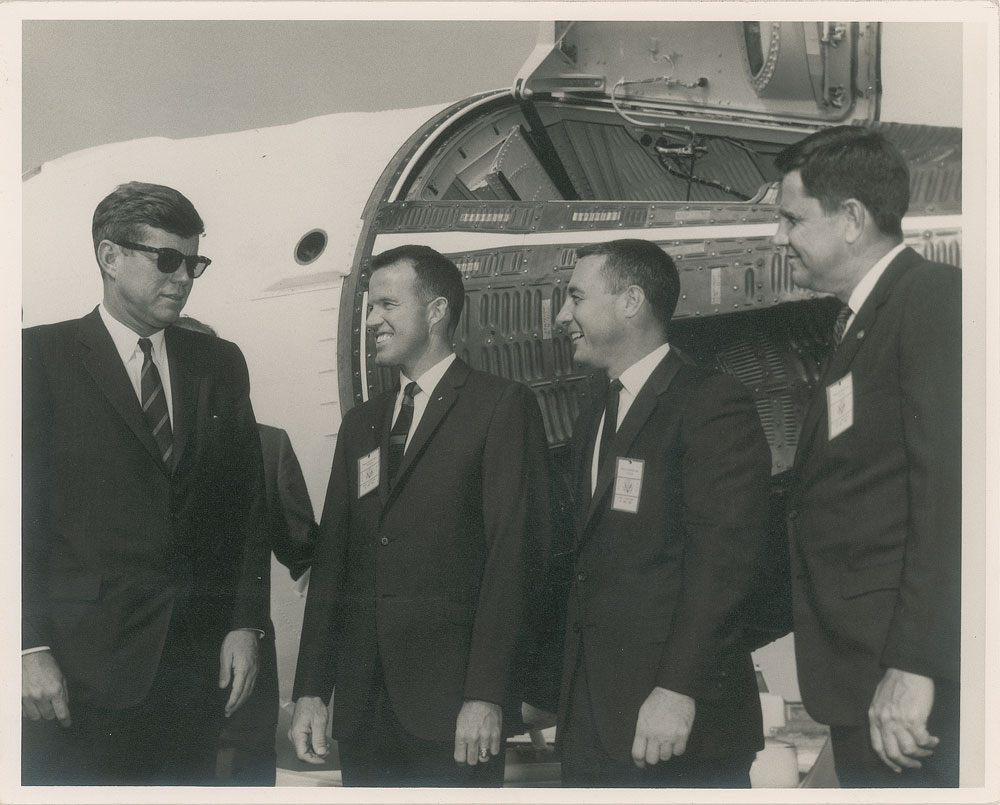 Attractive pair of vintage original matte-finish 10 x 8 NASA photos of President John F. Kennedy and Mercury astronauts Gus Grissom and Gordon Cooper during a tour of Cape Canaveral, Florida, on November 16, 1963. The astronauts briefed Kennedy on the Gemini two-man spacecraft, a mock-up of which is visible in the background. In overall fine condition, with a couple light impressions to one photo. From the M. Edward Thomas Collection.