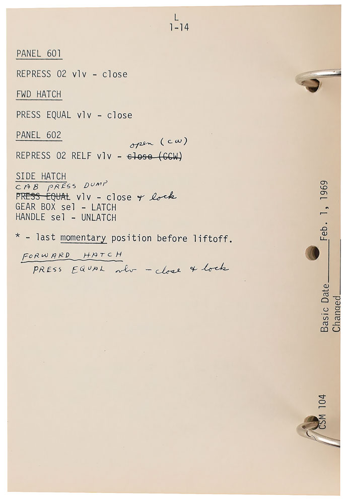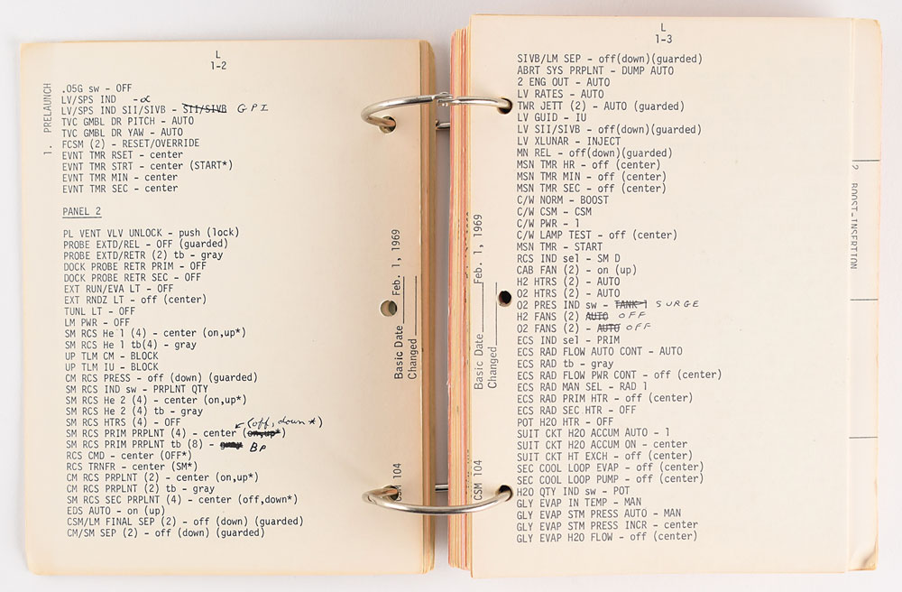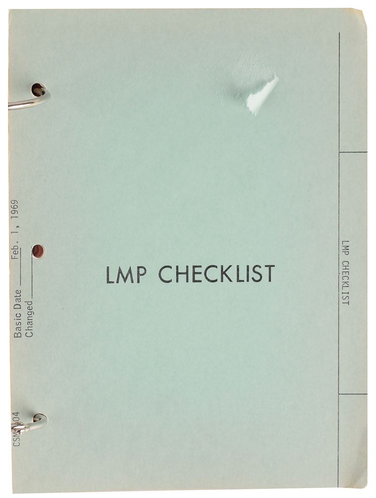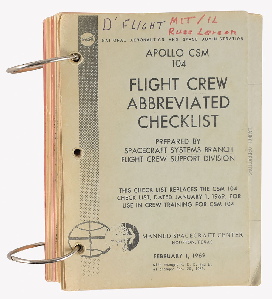 Official ring-bound NASA checklist entitled "Apollo CSM 104, Flight Crew Abbreviated Checklist" used by Russell A. Larson of MIT's Instrumentation Laboratory, prepared by the Manned Spacecraft Center's Spacecraft Systems Branch, 6 x 8, February 1, 1969, marked on the front cover in felt tip, "D'Flight, MIT/IL, Russ Larson." The abbreviated checklist is divided into sections for "Launch Operations," "CMP Checklist," "LMP Checklist," and "Entry Operations," each containing its own subsections. Several pages have been annotated with changes or additions to procedures and instructions. In fine condition, with light general wear from use. Russ Larson worked as a program engineer and astronaut liaison at MIT's Instrumentation Lab, where he was involved in programming the Lunar Module's Apollo Guidance Computer; he worked directly with the astronaut crews, training them on the simulators and guidance system. From the Don Eyles Apollo Computer Collection.