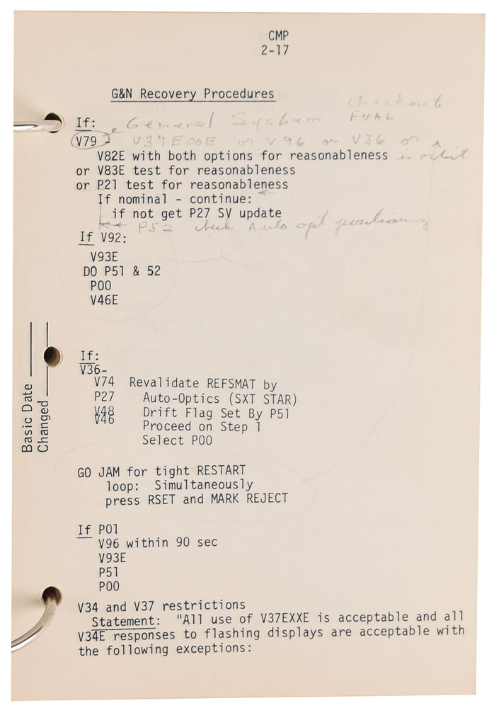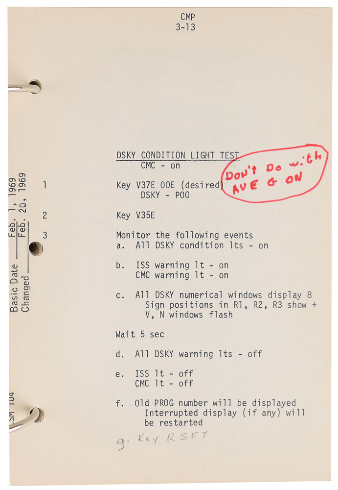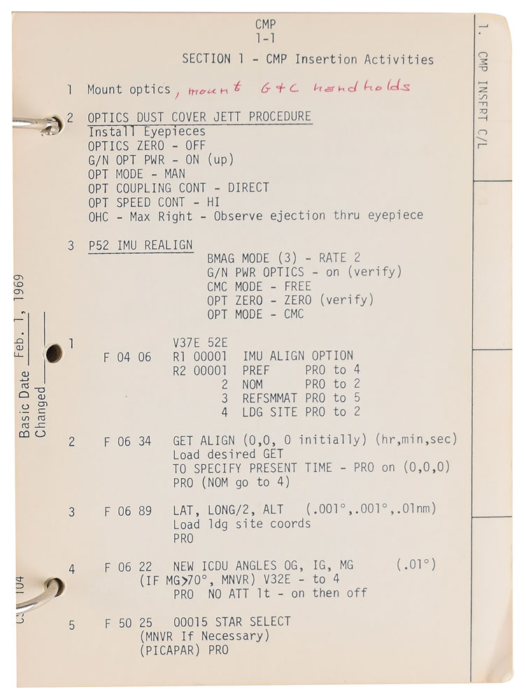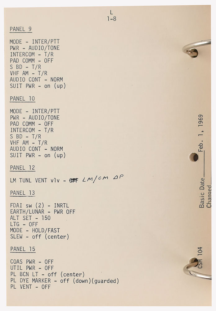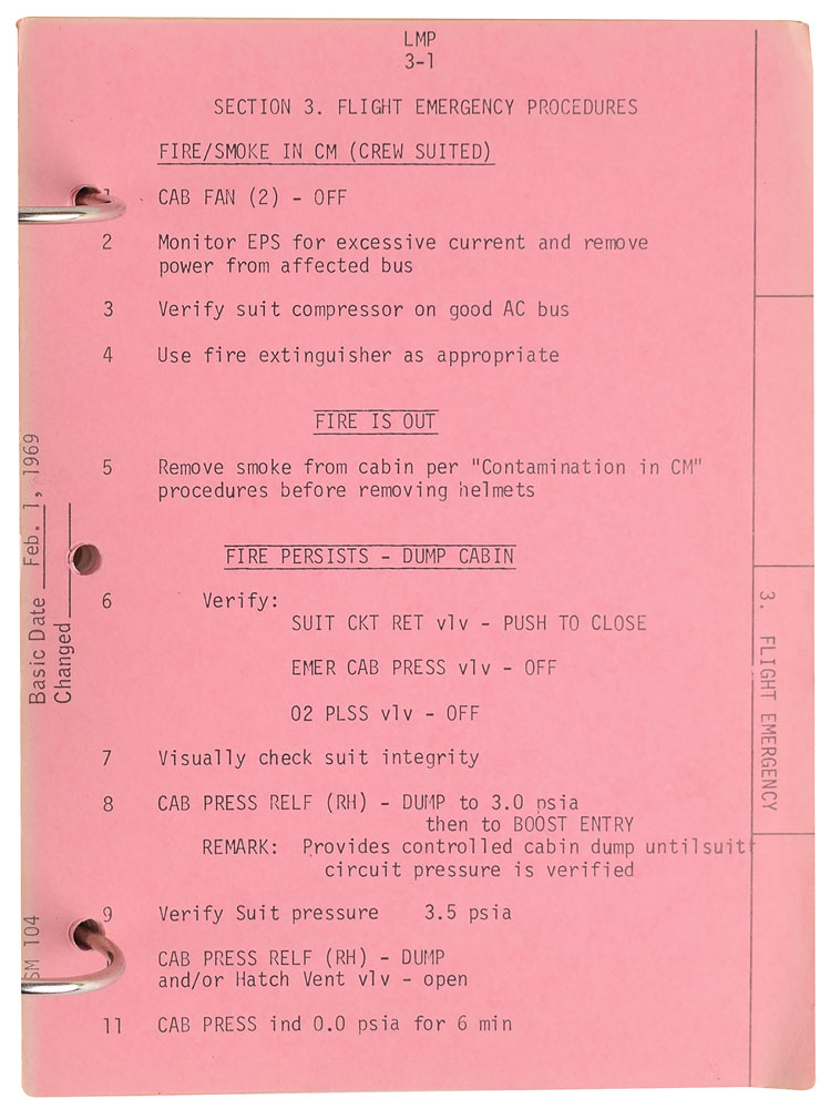 Official ring-bound NASA checklist entitled "Apollo CSM 104, Flight Crew Abbreviated Checklist" used by Russell A. Larson of MIT's Instrumentation Laboratory, prepared by the Manned Spacecraft Center's Spacecraft Systems Branch, 6 x 8, February 1, 1969, marked on the front cover in felt tip, "D'Flight, MIT/IL, Russ Larson." The abbreviated checklist is divided into sections for "Launch Operations," "CMP Checklist," "LMP Checklist," and "Entry Operations," each containing its own subsections. Several pages have been annotated with changes or additions to procedures and instructions. In fine condition, with light general wear from use. Russ Larson worked as a program engineer and astronaut liaison at MIT's Instrumentation Lab, where he was involved in programming the Lunar Module's Apollo Guidance Computer; he worked directly with the astronaut crews, training them on the simulators and guidance system. From the Don Eyles Apollo Computer Collection.