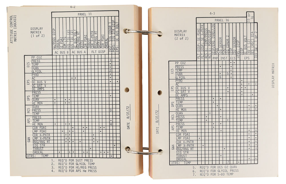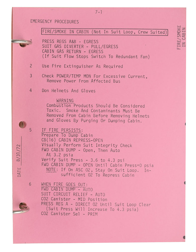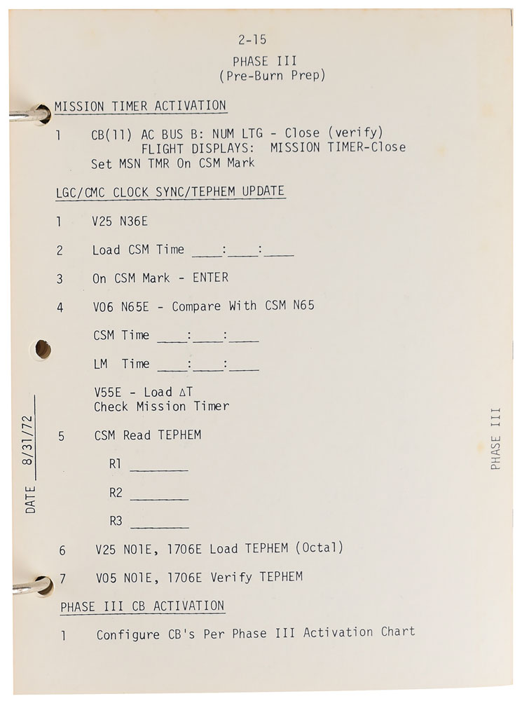 Official ring-bound NASA checklist entitled "Apollo 17, All Launch Dates, Change B, LM Contingency Checklist," prepared by the Manned Spacecraft Center's Flight Procedures Branch, 6 x 8, November 24, 1972, marked on the front cover in black felt tip, "MIT." The contingency checklist is divided into nine sections, labeled "30-Minute Activation Section," "Modular Activation Section," "Docked Deactivation Section," "Charts," "Special Procedures Section," "Contingency EVT/IVT Section," "Emergency Section," "Real Time Checklist Section," and "LM Reactivation for Jettison." In very good condition, with light foxing and a few edges tears to the front cover (including a torn upper punch hole), and creasing and rippling to some pages. From the Don Eyles Apollo Computer Collection.