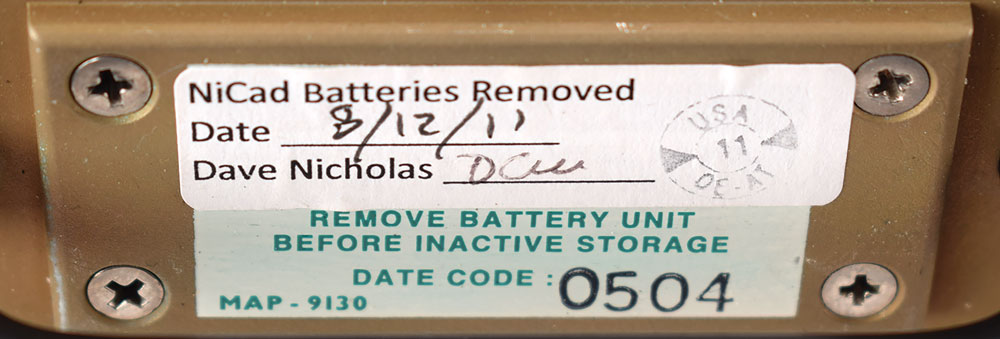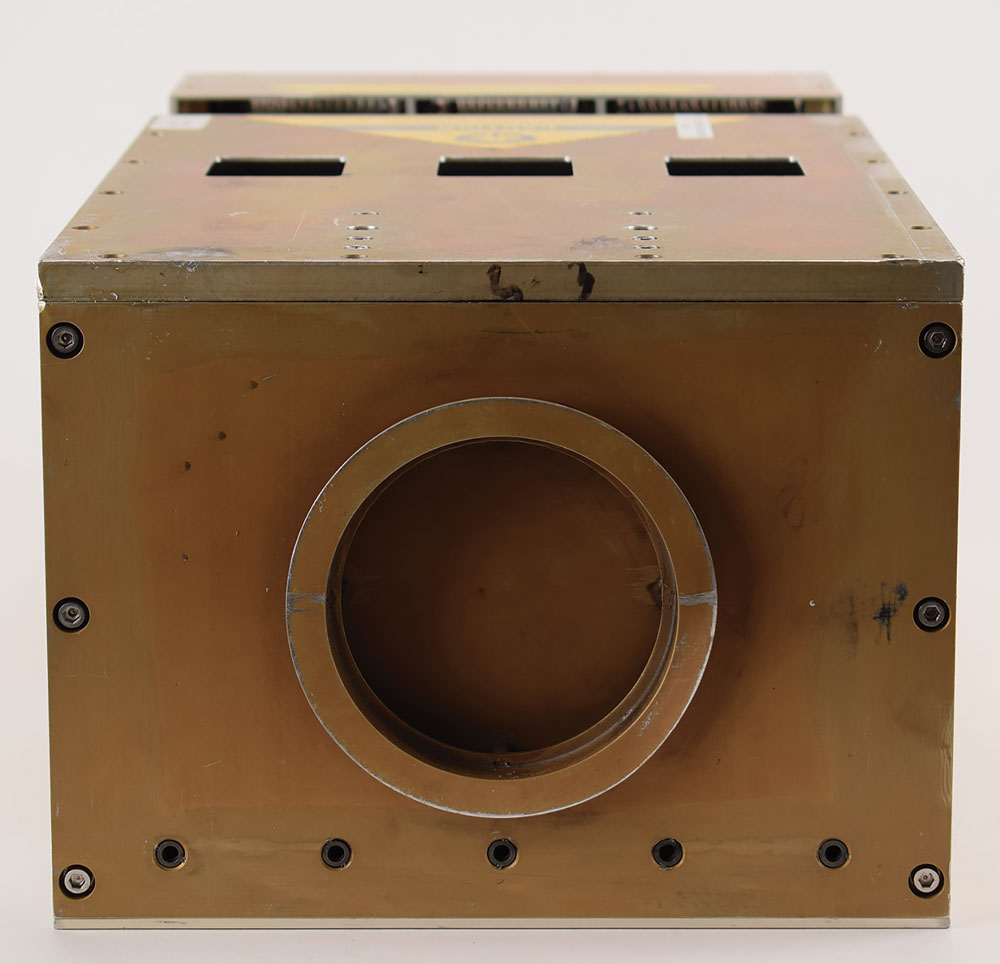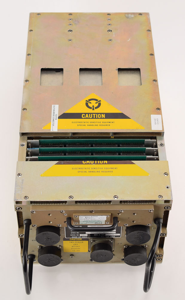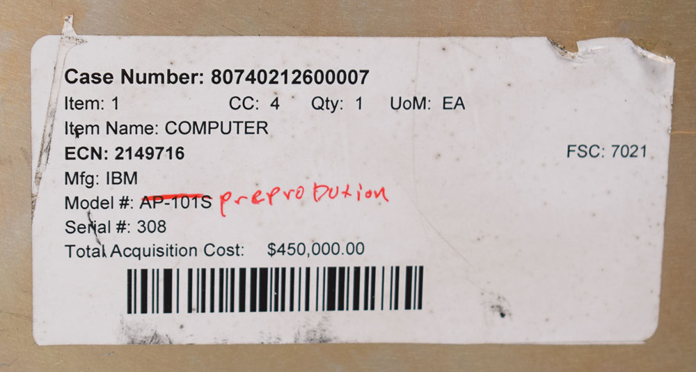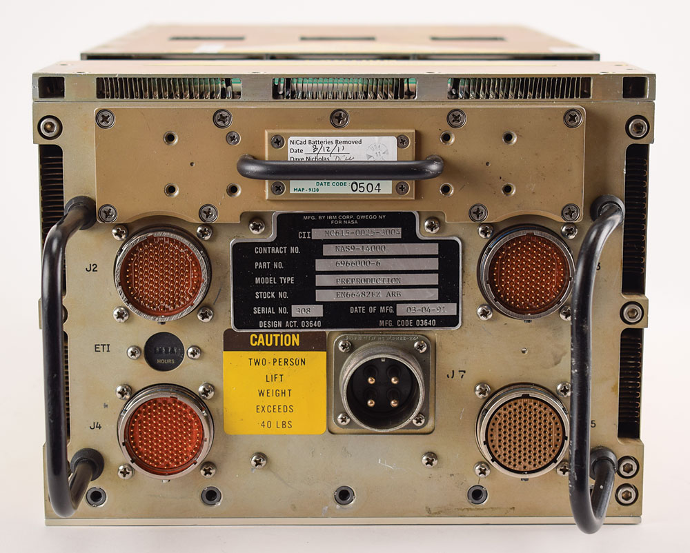IBM AP-101S general purpose computer designed for use on the Space Shuttle, measuring approximately 10″ x 7.75″ x 23.5″, with the black manufacturer's tag on the front: "Mfg. by IBM Corp. Owego NY for NASA, CII MC615-0025-3004, Contract No. NAS9-14000, Part No. 6966000-6, Model Type Preproduction, Stock No. EN66482FZ ARB, Serial No. 308, Date of Mfg. 03-04-91." The front has five ports labeled "J2," "J3," "J4," "J5," and "J7," as well as an elapsed time indicator. In very good to fine condition, with a label on top noting "Caution-Broke Connector," and the deaccession label on the side indicating an acquisition cost of $450,000. A label on the front also indicates that the NiCad batteries have been removed.