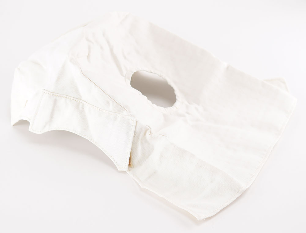 Thermal garment for the Space Shuttle Extravehicular Mobility Unit (EMU) suit, made of an insulated white Ortho-Fabric with an ILC Space Systems tag inside: "Item: EMU TV Thermal Garment, Part No. 10160-20064-01, Serial No. N/A, Size N/A, Code ID 74897, Mfg. 10/85, Contract No. NAS9-16589." Lights and TV cameras were mounted above the astronaut's head in the EMU suit. In fine condition.