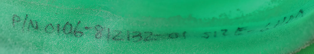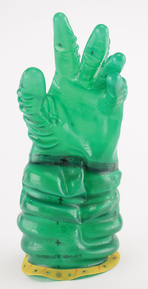Left-handed internal bladder for a Space Shuttle/International Space Station Extravehicular Mobility Unit (EMU) Phase VI glove, annotated outside the wrist, "0106-812537-01-6HM," and inside the wrist, "P/N 0106-812132-01, Size: 6HM, S/N 038." The bladder is made of a green urethane material and is designed to maintain pressure in the EMU glove assembly, while not limiting the finger joints and wrist gimbals. Includes the original deaccession bag, noting an acquisition cost of $5,000. In very good to fine condition.