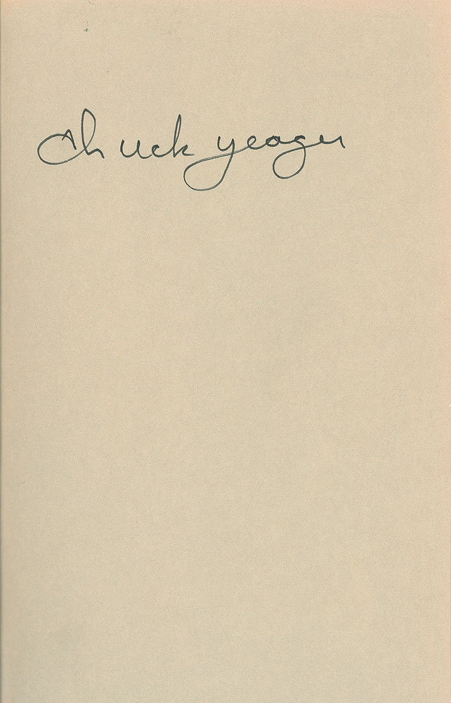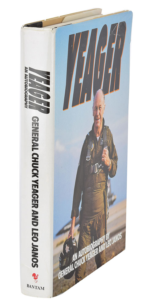 Signed book: Yeager. Later printing. NY: Bantam Books, 1985. Hardcover with dust jacket, 6.5 x 9.25, 342 pages. Signed on the first free end page in black felt tip by Chuck Yeager. In very good to fine condition, with some creasing and edge tears to the dust jacket.