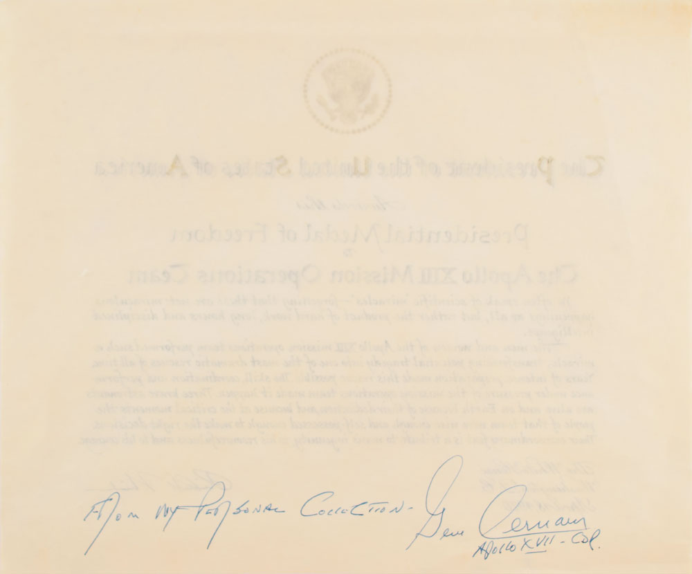 Rare Presidential Medal of Freedom certificate presented to Apollo astronaut Gene Cernan as a member of "The Apollo XIII Mission Operations Team," one page, 12 x 10, dated April 18, 1970, in part: "The men and women of the Apollo XIII mission operations team performed such a miracle, transforming potential tragedy into one of the most dramatic rescues of all time." Lower right bears a preprinted facsimile signature of President Richard Nixon. Signed on the reverse in blue ink, "From my personal collection. Gene Cernan, Apollo XVII—CDR." In fine condition, with some light creasing to the top.