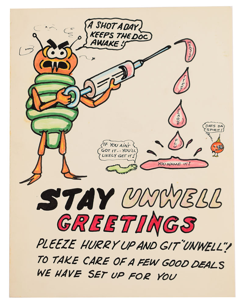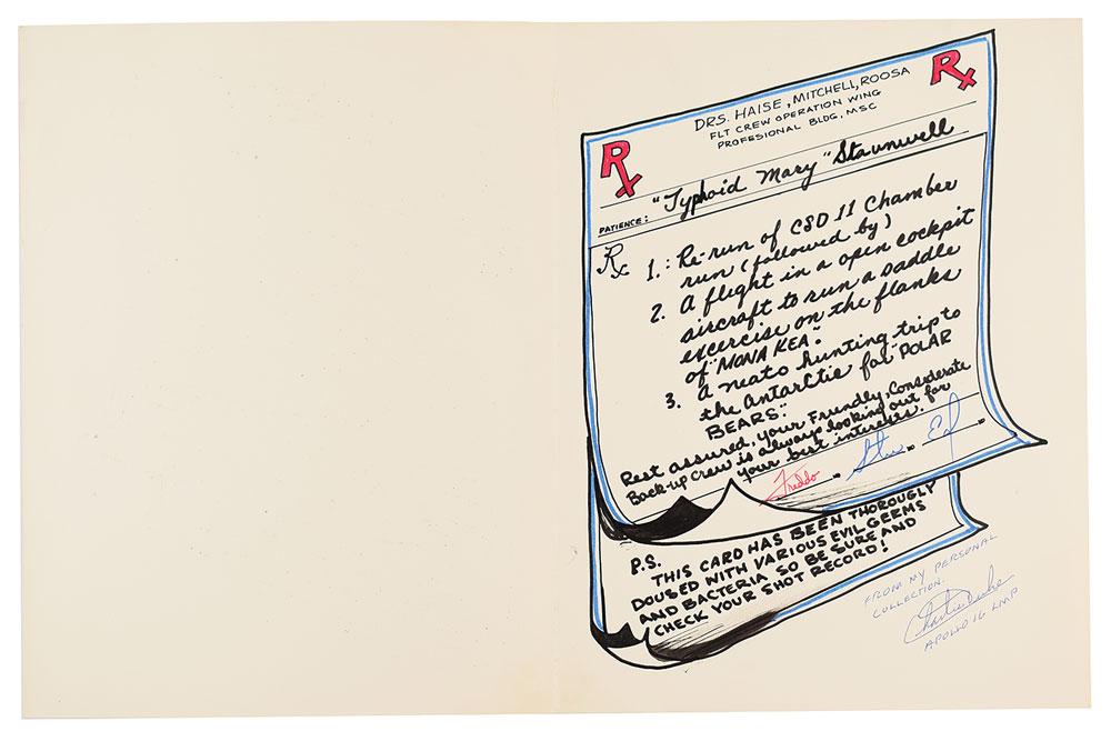 Humorous handmade 'gag' greeting card presented to moonwalker Charlie Duke by the Apollo 16 backup crew of Edgar Mitchell, Fred Haise, and Stuart A. Roosa, two pages on two adjoining cardstock sheets, 8.75 x 11, signed on the second page in blue ballpoint, "From my personal collection. Charlie Duke, Apollo 16 LMP," and in red and blue felt tip, "Freddo," "Stu," and "Ed." Accomplished in crayon and colored felt tip, the card front features a large insect-like germ holding a disease-filled syringe, with bold text below reading: "Stay Unwell Greetings, Pleeze hurry up and git 'unwell'! to take care of a few good deals we have set up for you." A speech bubble next to the large germ says, "A shot a day keeps the doc awake," and speech bubbles next to two smaller germs: "If you ain't got it—you'll likely get it!" and "Dats da spirit!" The inside of the card features a medical sheet from the practice of "Drs. Haise, Mitchell, Roosa, Flt. Crew Operation Wing, Professional Bldg., MSC," with "Patience" name listed as "'Typhoid Mary' Staunwell." The memo reads: "1. Re-run of CSD 11 Chamber run (followed by), 2. A flight in a open cockpit aircraft to run a saddle exercise on the flanks of 'Mona Kea,' 3. A neato hunting trip to the Antarctic for 'Polar Bears.' Rest assured, your friendly, considerate back-up crew is always looking out for our best interests." A postscript reads: "This card has been thoroughly doused with various evil germs and bacteria so be sure and check your shot record!" In fine condition.